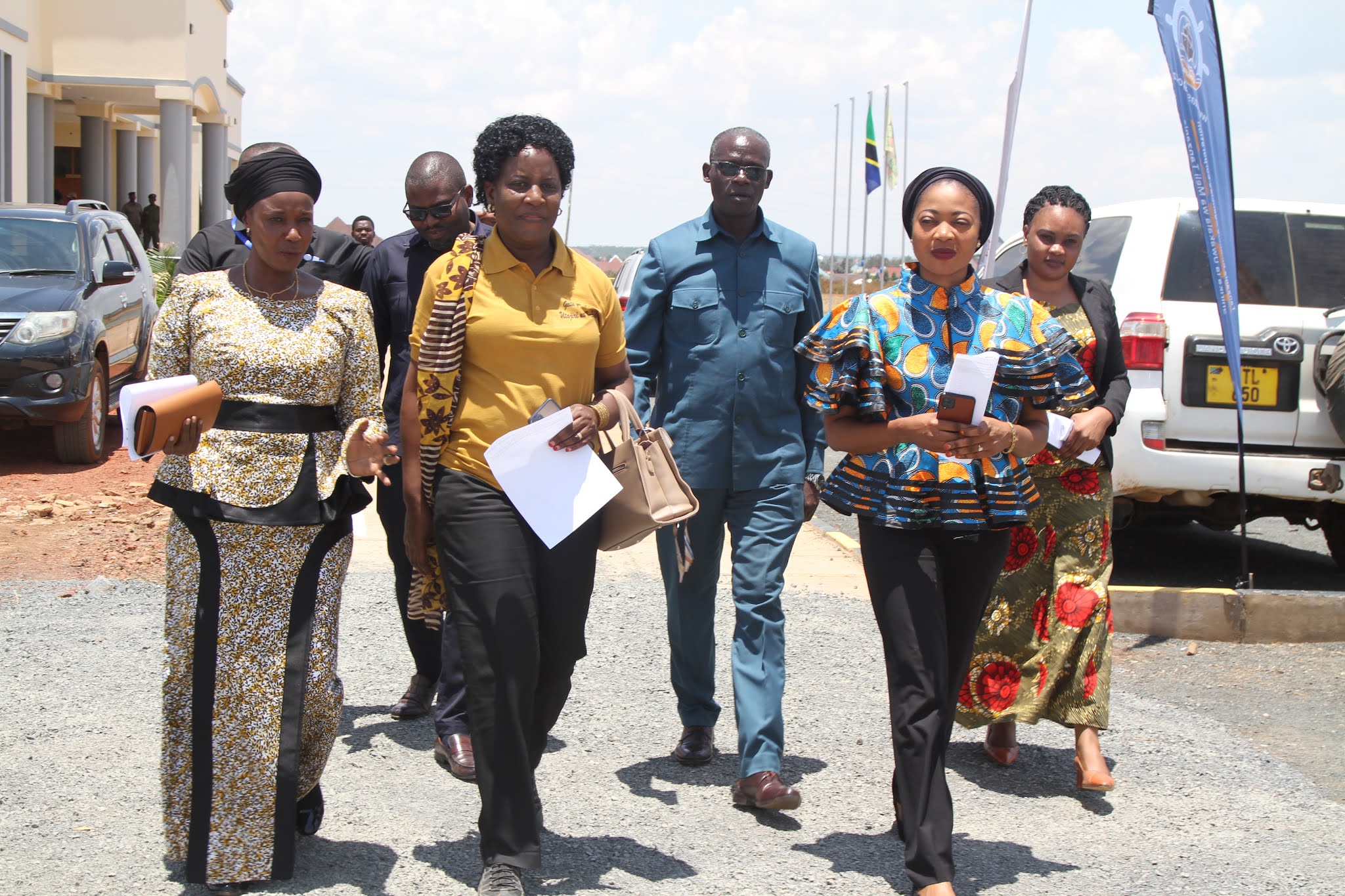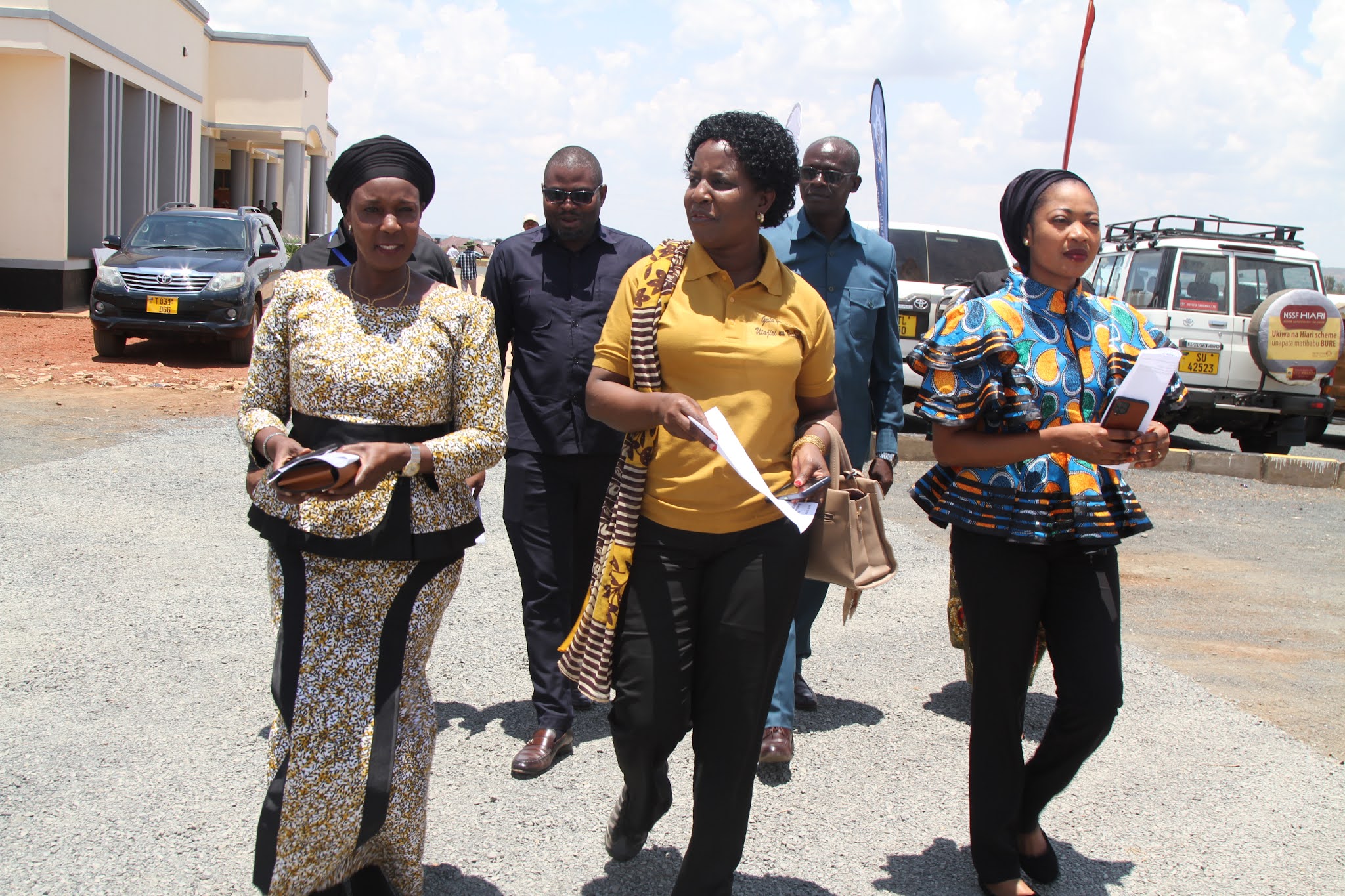Mwanasheria wa Wizara ya Madini Godfrey Nyakisinda (wa kwanza kushoto) akizungumza mbele ya Mkuu wa Mkoa wa Geita Rosemary Senyamule (kulia) wakati wa ziara ya viongozi kutembelea mabanda katika maonesho ya Madini Mjini Geita. (wa pili kushoto) ni Kaimu Kamishna wa uongezaji thamani kutoka Wizara ya Madini Betha Luzabiko.