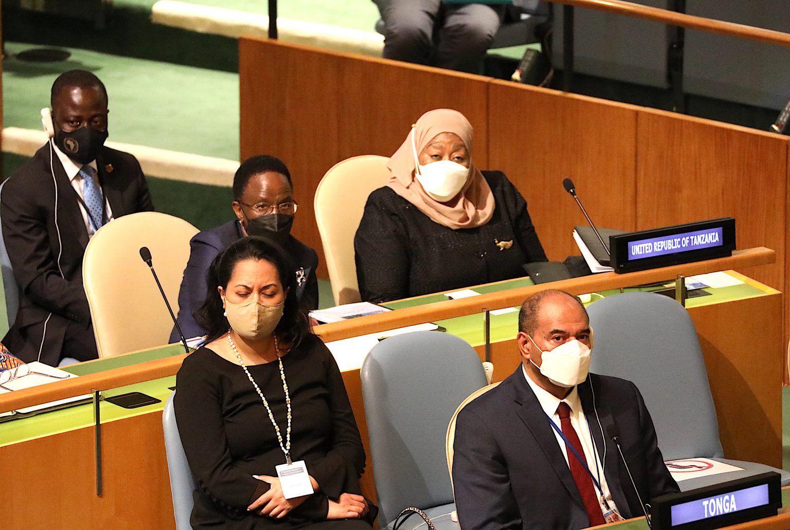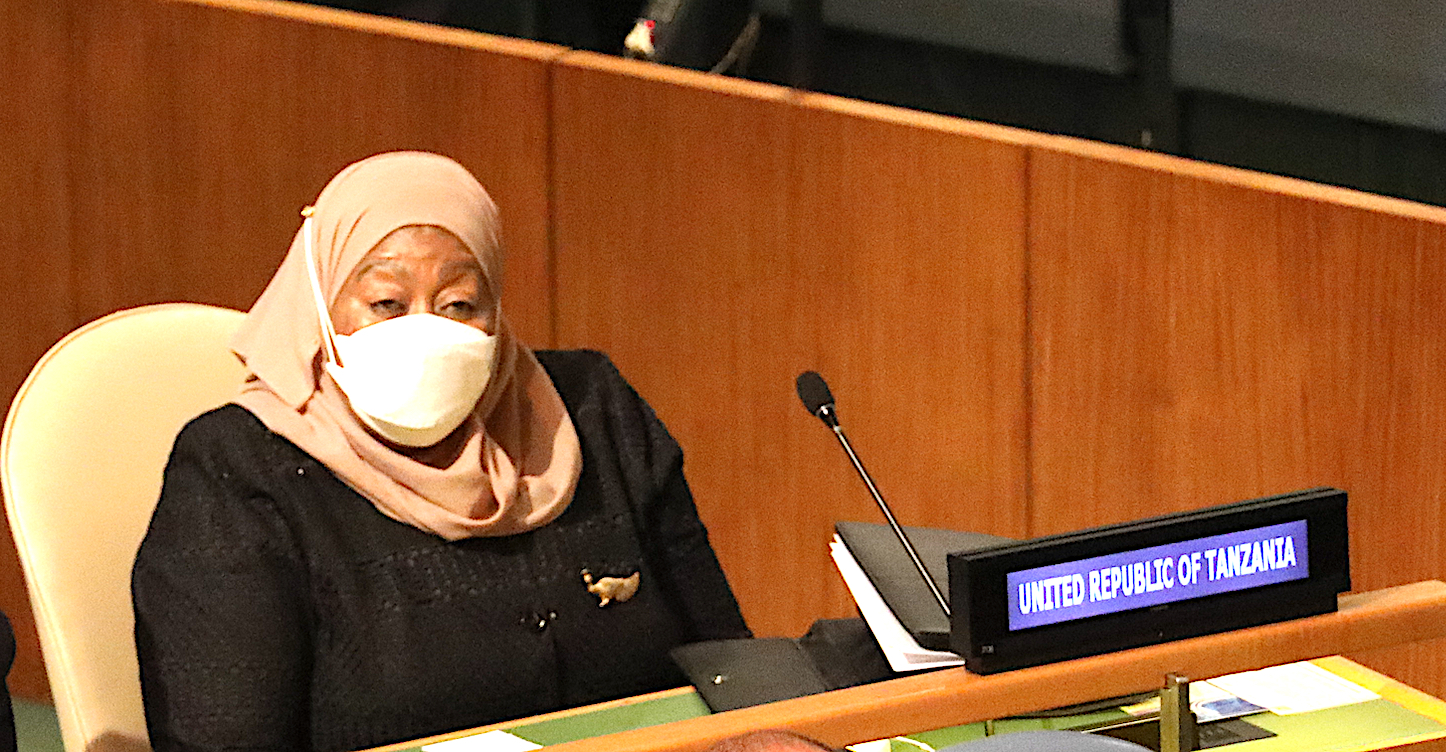 Rais wa Jamhuri ya Muungano wa Tanzania Mhe. Samia Suluhu Hassan, leo Sept 21,2021 ameshiriki katika ufunguzi wa mkutano wa 76 wa Baraza Kuu la Umoja wa Mataifa UN unaofanyika Jijini New York Marekani. Wa pili kushoto Waziri wa Mambo ya Nje na Ushirikiano wa Afrika Mashariki Balozi Liberata Mulamula. PICHA NA IKULU.