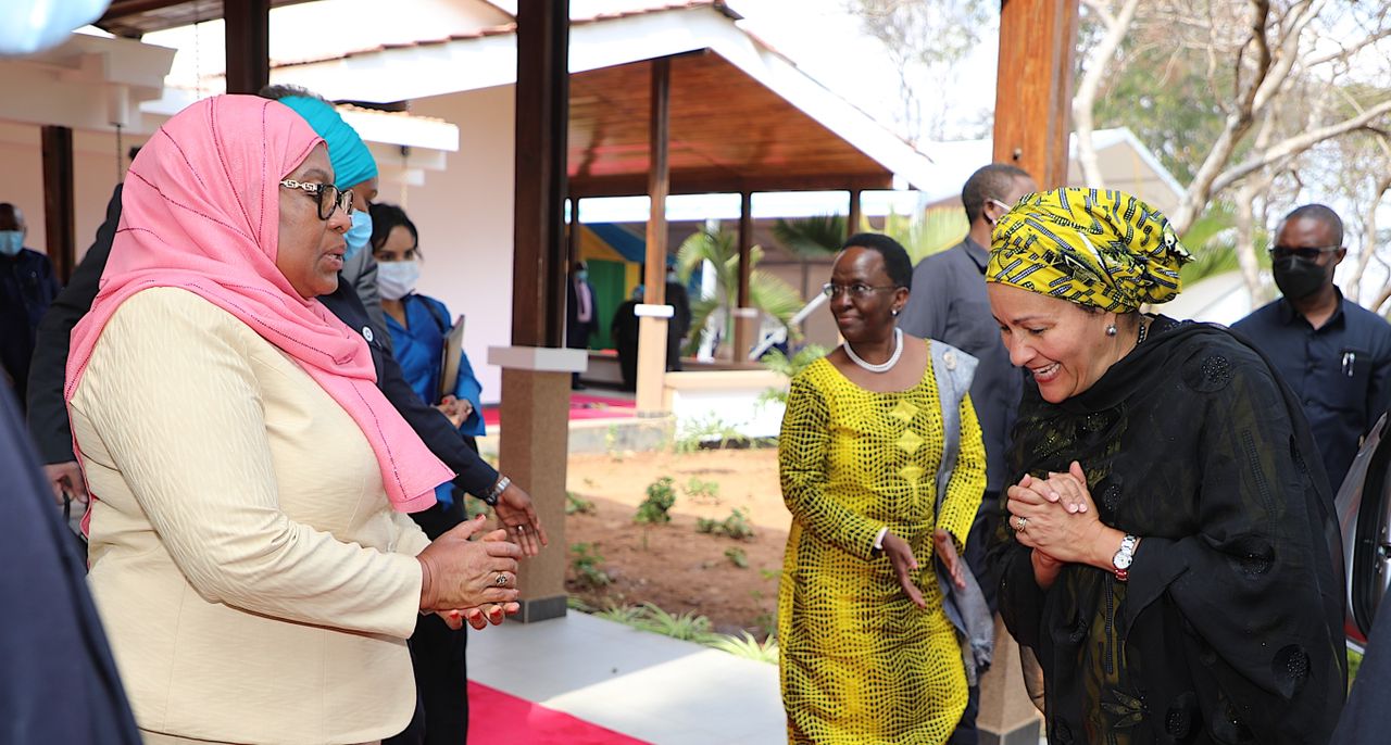 Rais wa Jamhuri ya Muungano wa Tanzania Mhe. Samia Suluhu Hassan akisalimiana na Naibu Katibu Mkuu wa Umoja wa Mataifa Bibi Amina J. Mohammed wakati Bibi Amina alipofika Ikulu Chamwino, Jijini Dodoma leo Sept 11, 2021.