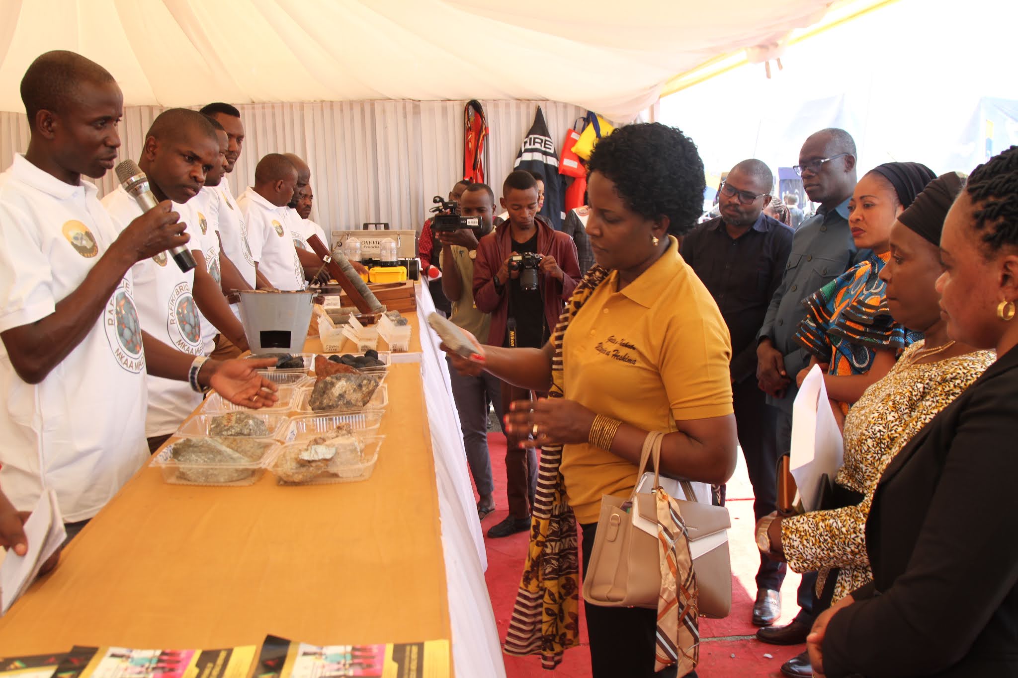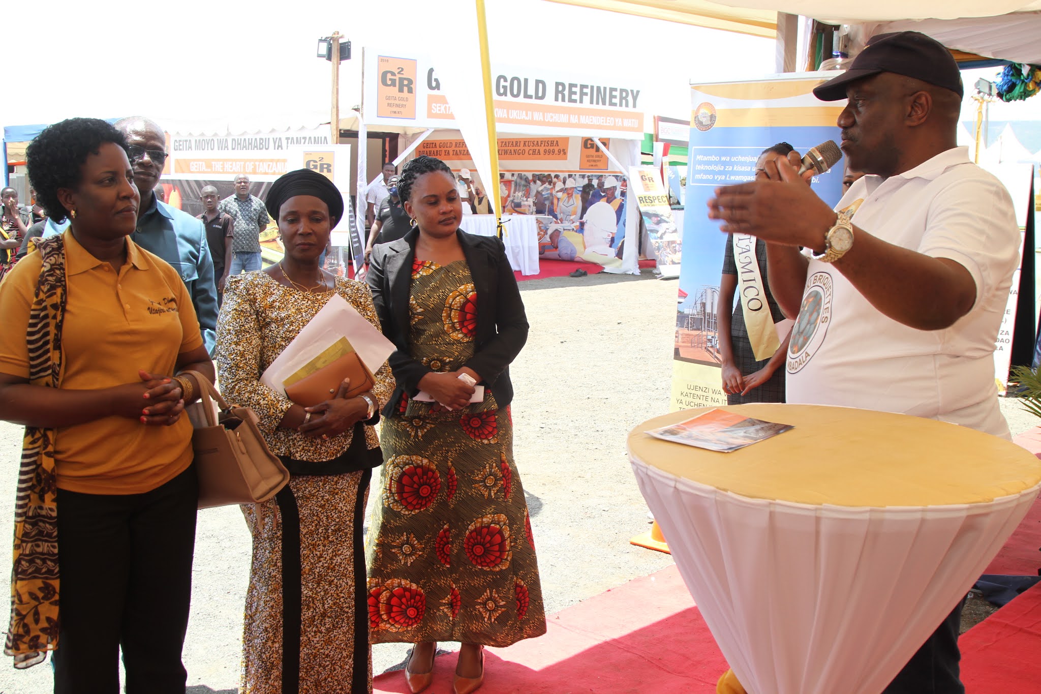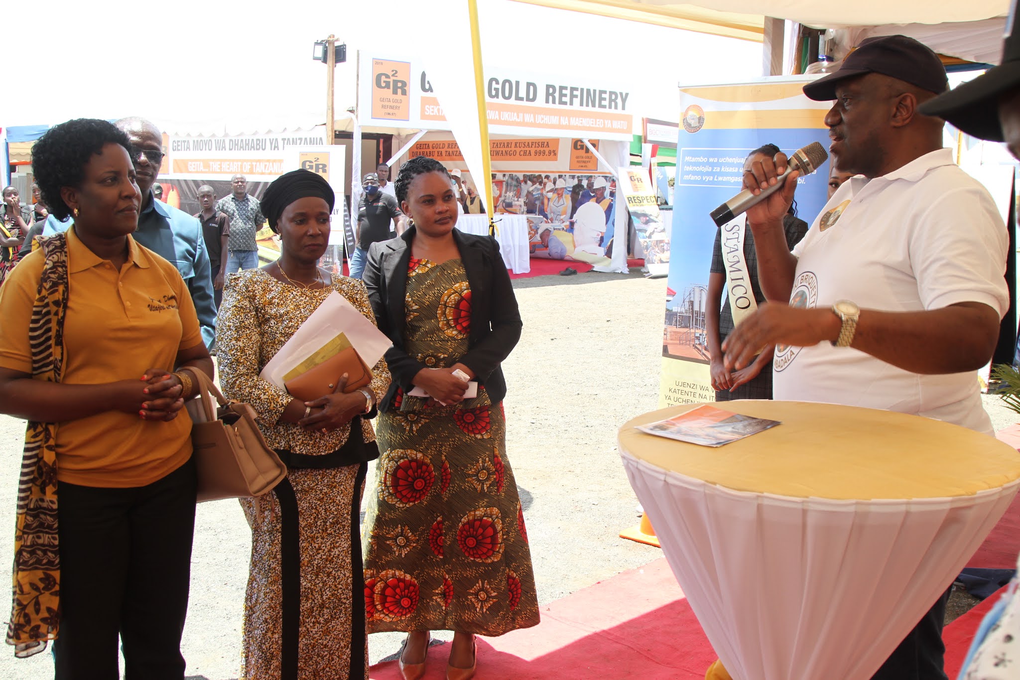 Mhandishi Uzalishaji wa Kiwanda cha kusafisha dhahabu cha Mwanza Precious Metals Refinery Limited (MPMR) (kushoto) akitoa maelezo Mbele ya Mgeni rasmi Mkuu wa Wilaya ya Nyamagana (katikati) alipokuwa kwenye Banda la STAMICO kujionea shughuli mbalimbali za Taasisi hiyo. (wa kwanza (wa tatu kulia) ni Mkuu wa Mkoa wa Geita Rosemary Senyamule.