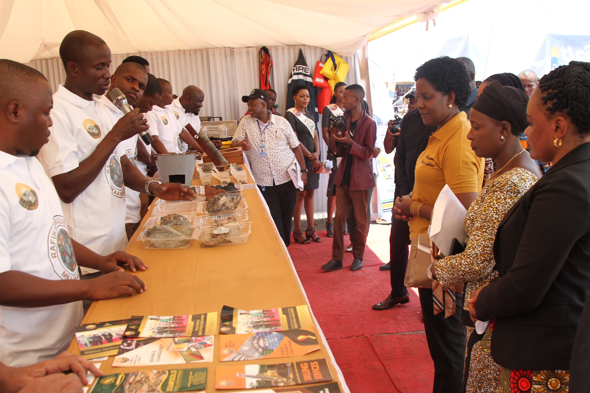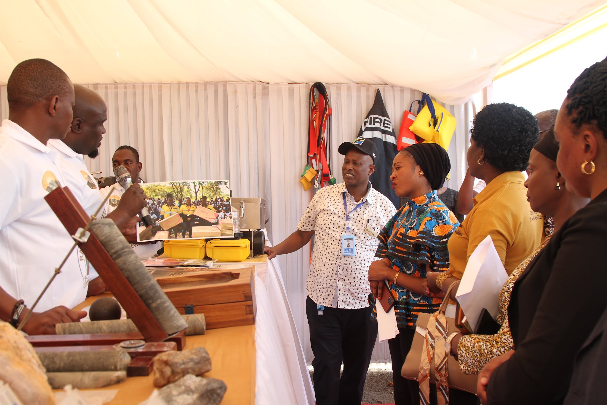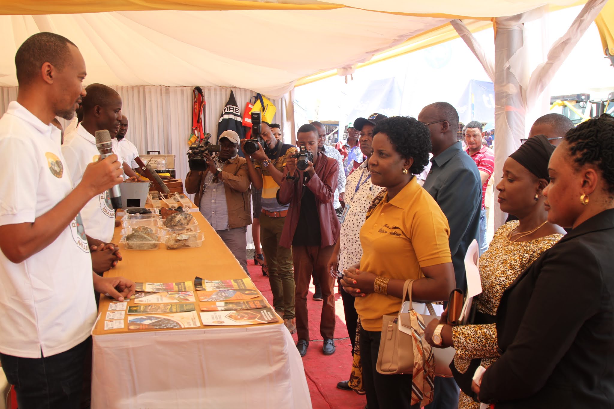 Mhandishi Uzalishaji wa Kiwanda cha kusafisha dhahabu cha Mwanza Precious Metals Refinery Limited (MPMR) (kushoto) akitoa maelezo Mbele ya Mgeni rasmi Mkuu wa Wilaya ya Nyamagana (katikati) alipokuwa kwenye Banda la STAMICO kujionea shughuli mbalimbali za Taasisi hiyo. (wa kwanza (wa tatu kulia) ni Mkuu wa Mkoa wa Geita Rosemary Senyamule.