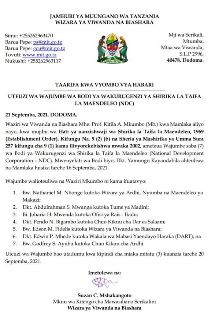 Home BUSINESS WAZIRI WA VIWANDA PROF. KITILA MKUMBOA ATEUA WAJUMBE SABA BODI YA NDC WAZIRI WA VIWANDA PROF. KITILA MKUMBOA ATEUA WAJUMBE SABA BODI YA NDC By HUGHES DUGILO - September 21, 2021 FacebookTwitterTelegramWhatsAppCopy URL Thank you for reading this post, don't forget to subscribe!