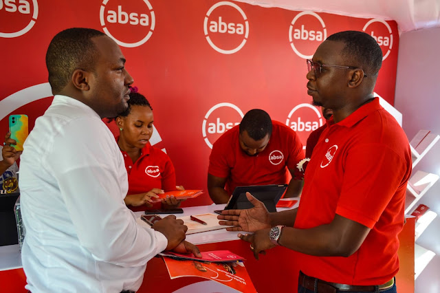 Meneja Uhusiano wa wa Benki ya Absa, Victor Nchimbi (kulia) akitoa maelezo ya huduma za kibenki kwa mmoja wa wafanyabiashara waliotembelea katika banda la benki hiyo, Charles Mishetto wakati wa maonesho ya wiki ya huduma za kifedha yanayoendelea katika viwanja vya Mnazi Mmoja jijini Dar es Salaam. Wengine ni maofisa wa benki hiyo.