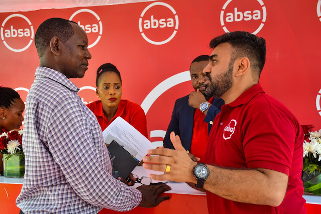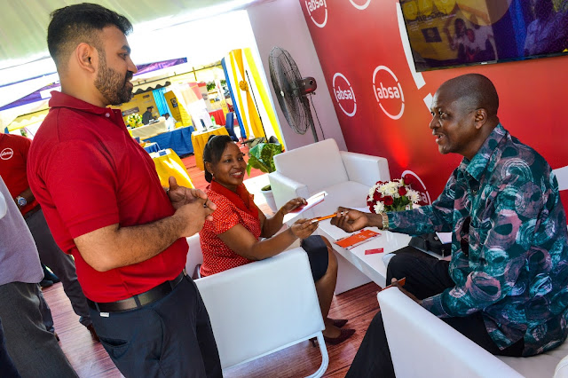 Mkuu wa Kitengo cha Bima wa Benki ya Absa, Sandeep Chavda (kushoto) akiwa na Mfanyabashara, Anic Kashasha wakati akitembelea banda la benki hiyo katika maonesho ya wiki ya huduma ya fedha kitaifa yanayoendelea katika viwanja vya Mnazi Mmoja jijini Dar es Salaam. Katikati ni Meneja wa Kitengo cha Wateja Maalum, Agnes Mushi.