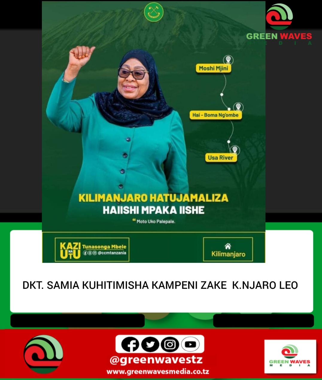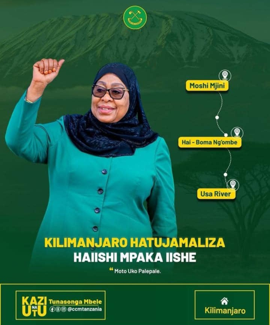 Mgombea wa Nafasi ya Urais wa Jamhuri ya Muungano wa Tanzania kwa tiketi ya Chama Cha Mapinduzi CCM Dkt. Samia Suluhu Hassan leo Jumatano Oktoba Mosi, 2025 anatarajiwa kuendelea na Mikutano yake ya hadhara ya Kampeni za uchaguzi Mkuu wa baadaye Mwezi huu, akitua Moshi Mjini na Hai Mkoani Kilimanjaro na baadaye Mchana kubisha hodi Mkoani Arusha, akitarajiwa kuwa na Mkutano mdogo wa hadhara Wilayani Arumeru kwenye eneo la Usa River.
