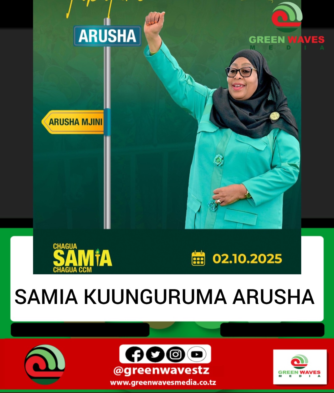 Mgombea wa nafasi ya Urais wa Jamhuri ya Muungano wa Tanzania kupitia Chama Cha Mapinduzi CCM Dkt. Samia Suluhu Hassan, leo Alhamisi Oktoba 02, 2025 anatarajiwa kuendelea na Kampeni zake Mkoani Arusha akitarajiwa kuwa na Mkutano mmoja mkubwa wa Kampeni kwenye Viwanja vya Sheikh Amri Abeid Jijini Arusha.