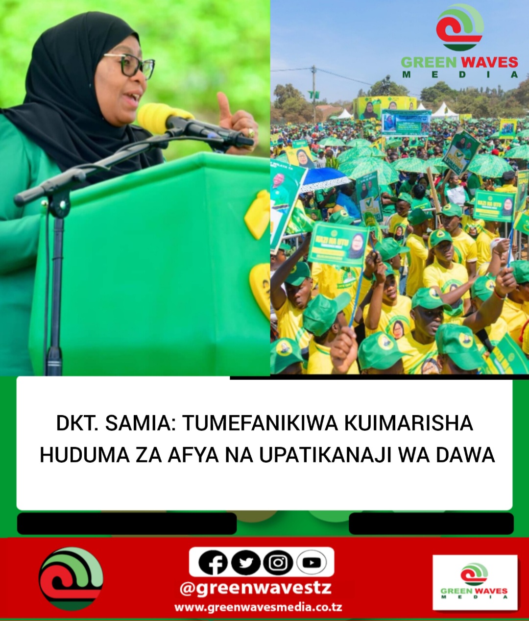 Mgombea Urais wa Jamhuri ya Muungano wa Tanzania kupitia Chama Cha Mapinduzi CCM Dkt. Samia Suluhu Hassan amesisitiza kuwa ndani ya Miaka mitano ijayo ikiwa atapewa ridhaa ya kuunda serikali amedhamiria kuendelea kuimarisha huduma za afya nchini kwa kuhakikisha utoshelevu wa dawa zote muhimu kwenye Vituo vya afya, kuongeza watumishi wa afya pamoja na Vifaa tiba kwenye Hospitali na Vituo vya afya nchini.