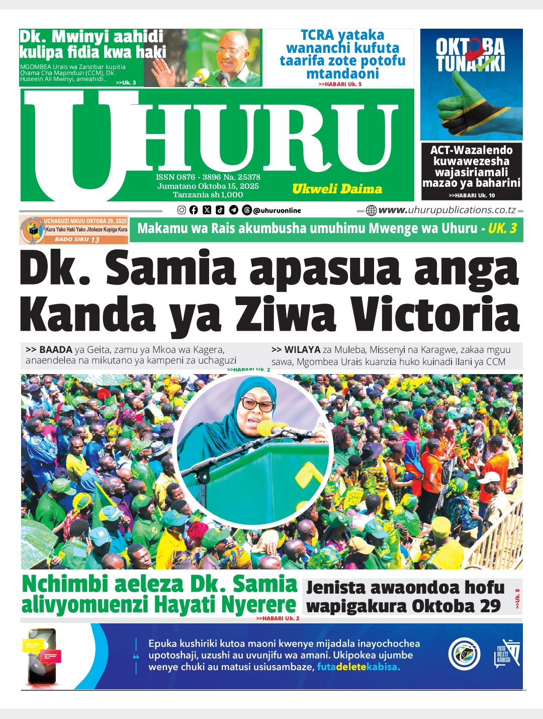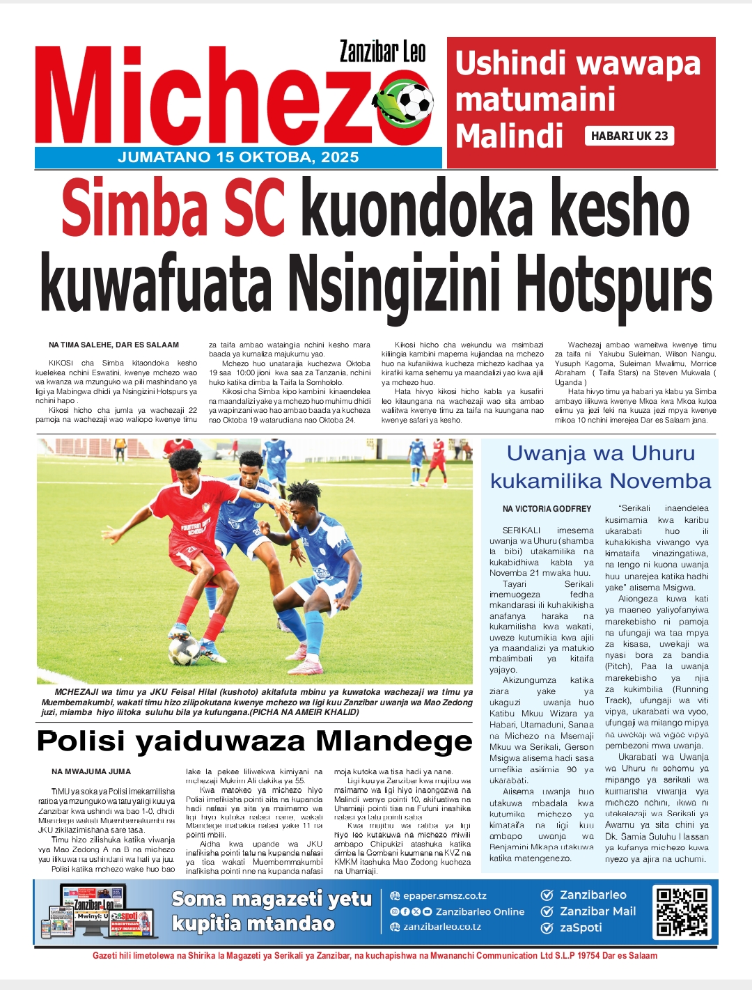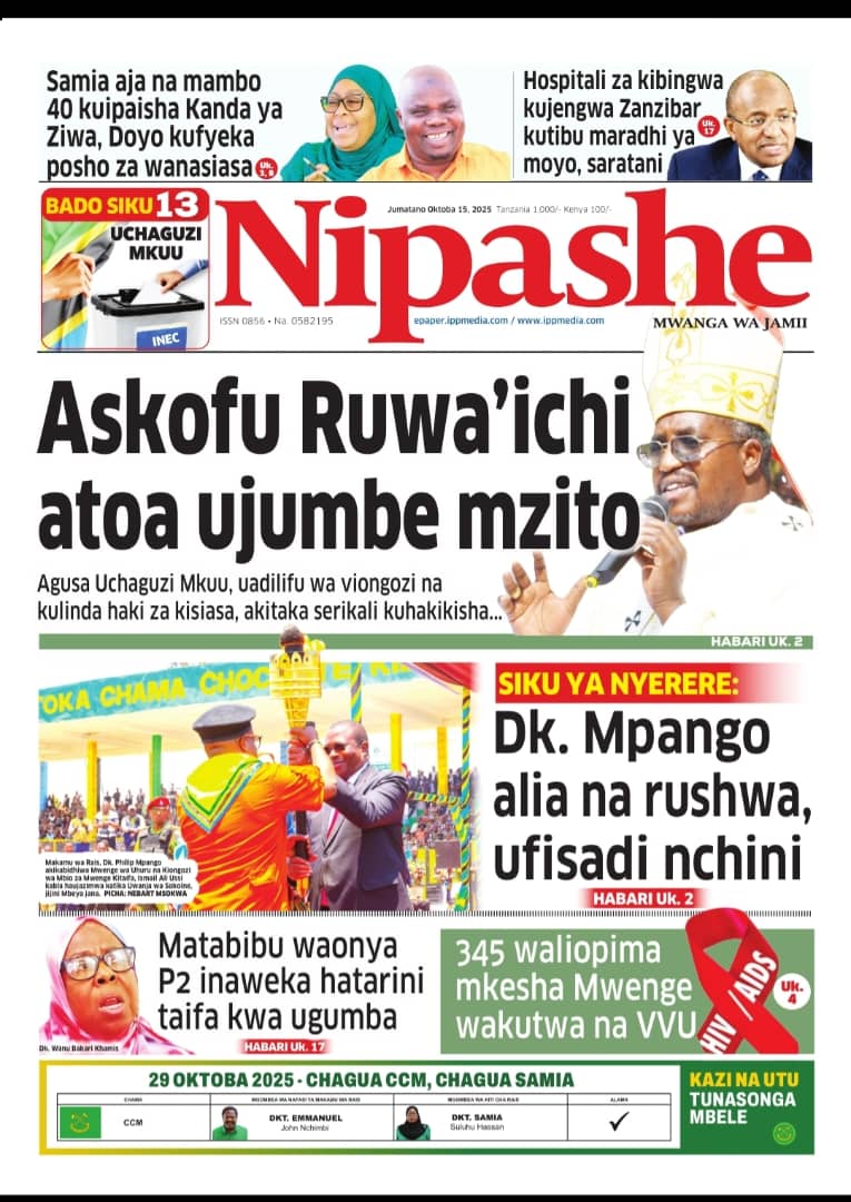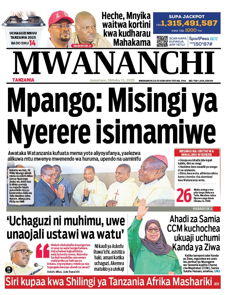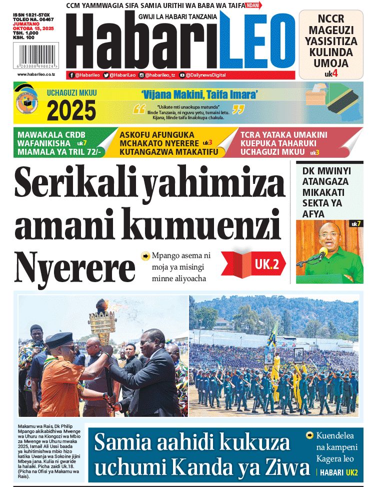 Home NEWSPAPERS HAYA HAPA MAGAZETI YA LEO JUMATANO OCTOBA 15_2025. HAYA HAPA MAGAZETI YA LEO JUMATANO OCTOBA 15_2025. By ENNA SIMION - October 15, 2025 FacebookTwitterTelegramWhatsAppCopy URL Thank you for reading this post, don't forget to subscribe! http://HAYA HAPA MAGAZETI YA LEO JUMATANO OCTOBA 15_2025.