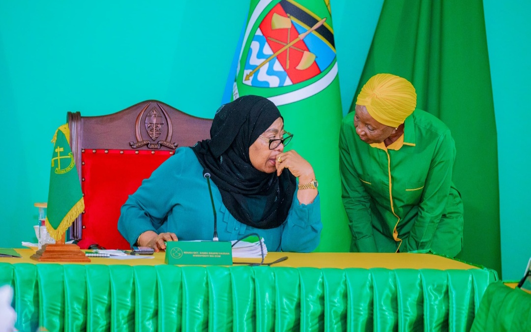 Mwenyekiti wa Chama Cha Mapinduzi (CCM) na Rais wa Jamhuri ya Muungano wa Tanzania Mhe. Dkt. Samia Suluhu Hassan akizungumza jambo na Katibu Mkuu wa chama hicho Balozi Dkt.Asha-Rose Migiro kabla ya kuanza kwa Kikao cha Kamati Kuu Maalum ya Halmashauri Kuu ya CCM Taifa cha uteuzi wa wagombea wa CCM wa nafasi za Mameya wa Majiji na Manispaa pamoja na Wenyeviti wa Halmashauri za miji na wilaya, kilichofanyika Zanzibar tarehe 29 Novemba 2025.