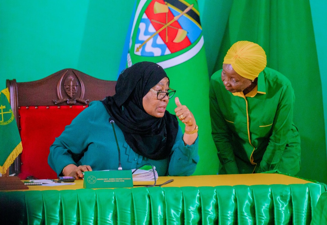 Mwenyekiti wa Chama Cha Mapinduzi (CCM) na Rais wa Jamhuri ya Muungano wa Tanzania Mhe. Dkt. Samia Suluhu Hassan akizungumza jambo na Katibu Mkuu wa chama hicho Balozi Dkt.Asha-Rose Migiro kabla ya kuanza kwa Kikao cha Kamati Kuu Maalum ya Halmashauri Kuu ya CCM Taifa cha uteuzi wa wagombea wa CCM wa nafasi za Mameya wa Majiji na Manispaa pamoja na Wenyeviti wa Halmashauri za miji na wilaya, kilichofanyika Zanzibar tarehe 29 Novemba 2025.