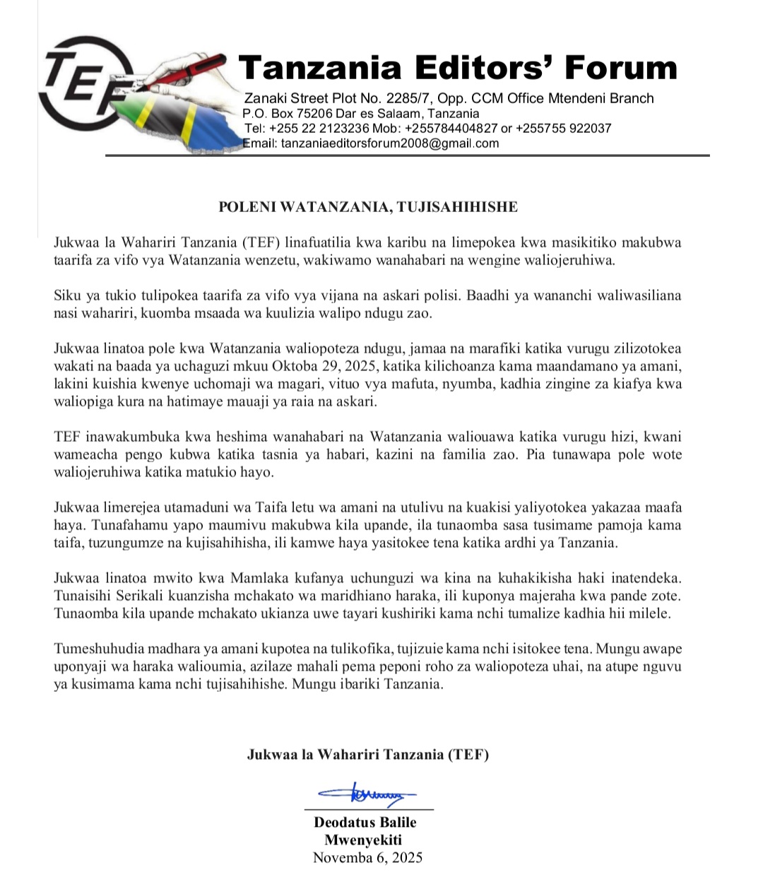 Home LOCAL TEF: POLENI WATANZANIA TUJISAHIHISHE. TEF: POLENI WATANZANIA TUJISAHIHISHE. By ENNA SIMION - November 6, 2025 FacebookTwitterTelegramWhatsAppCopy URL Thank you for reading this post, don't forget to subscribe!