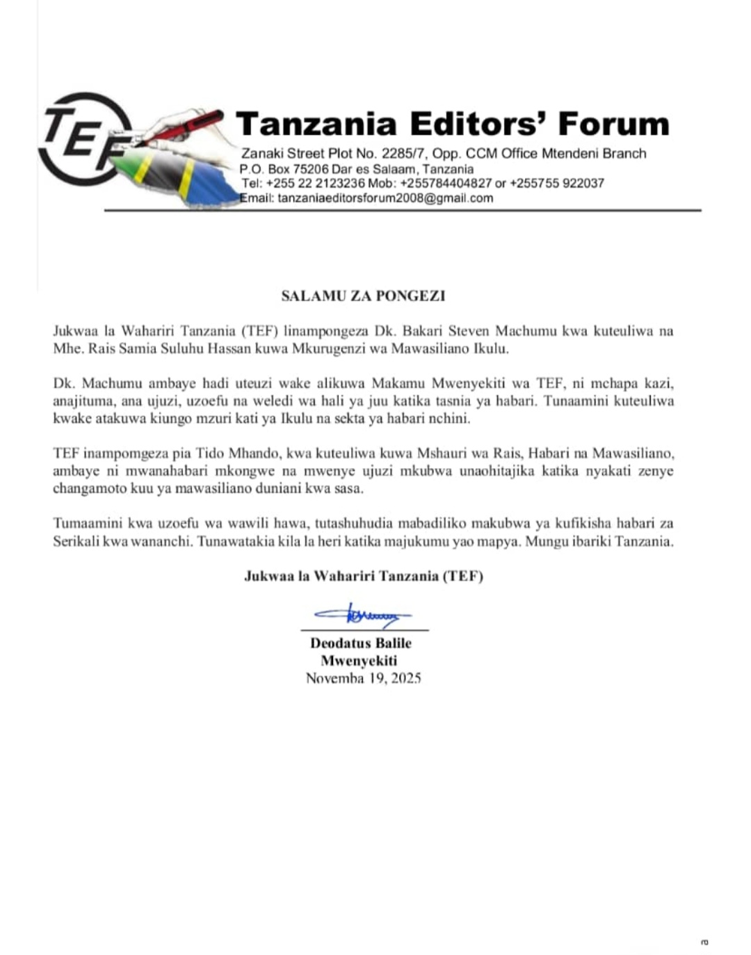 Home LOCAL TEF YAMPONGEZA BAKARI MACHUMU KUWA MKURUGENZI WA MAWASILIANO IKULU TEF YAMPONGEZA BAKARI MACHUMU KUWA MKURUGENZI WA MAWASILIANO IKULU By HUGHES DUGILO - November 19, 2025 FacebookTwitterTelegramWhatsAppCopy URL Thank you for reading this post, don't forget to subscribe!