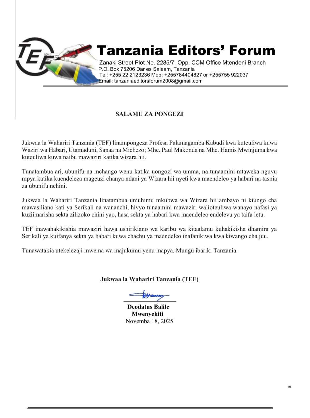 Home LOCAL TEF YAMPONGEZA PROF. KABUDI, WASAIDIZI WAKE KUONGOZA WIZARA YA HABARI TEF YAMPONGEZA PROF. KABUDI, WASAIDIZI WAKE KUONGOZA WIZARA YA HABARI By HUGHES DUGILO - November 18, 2025 FacebookTwitterTelegramWhatsAppCopy URL Thank you for reading this post, don't forget to subscribe!