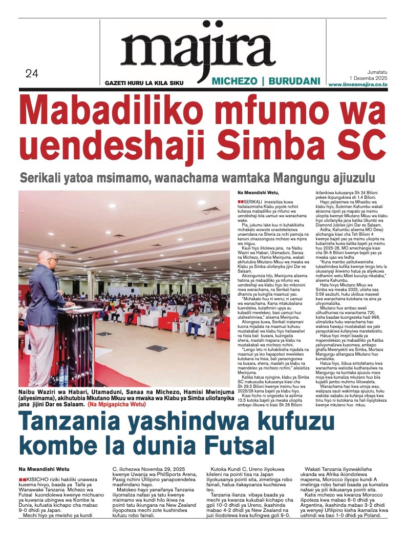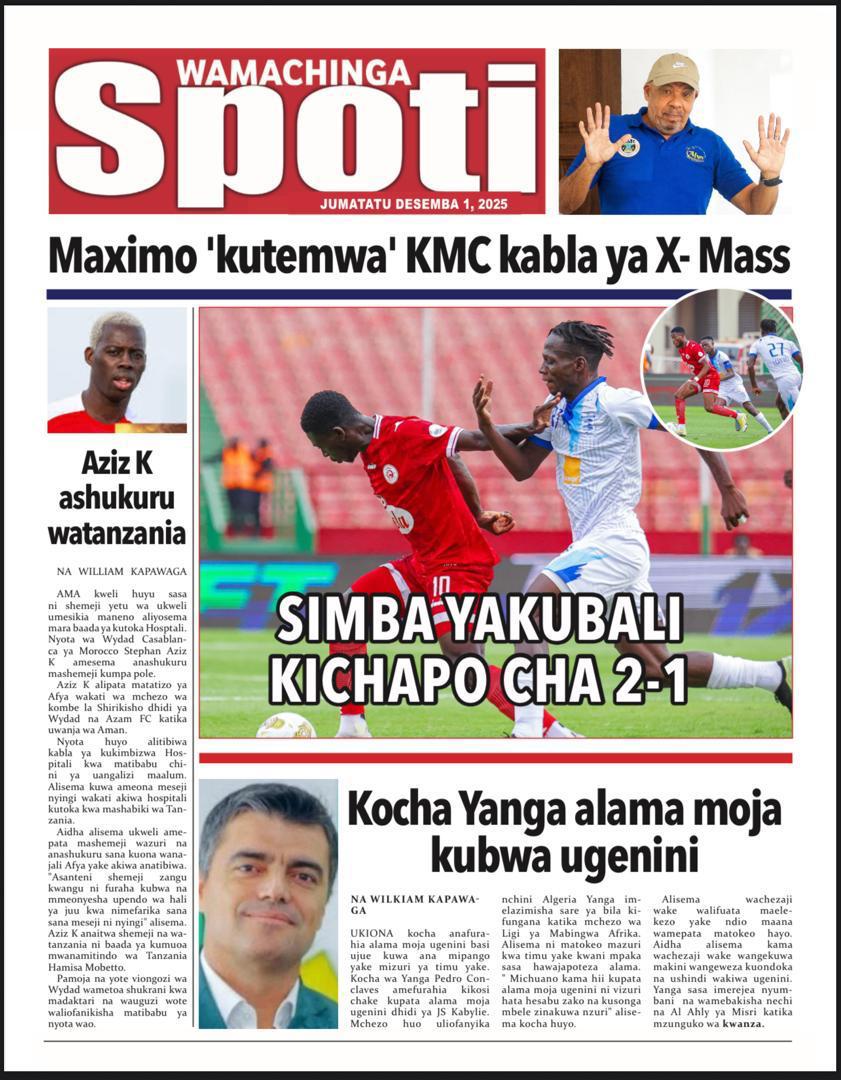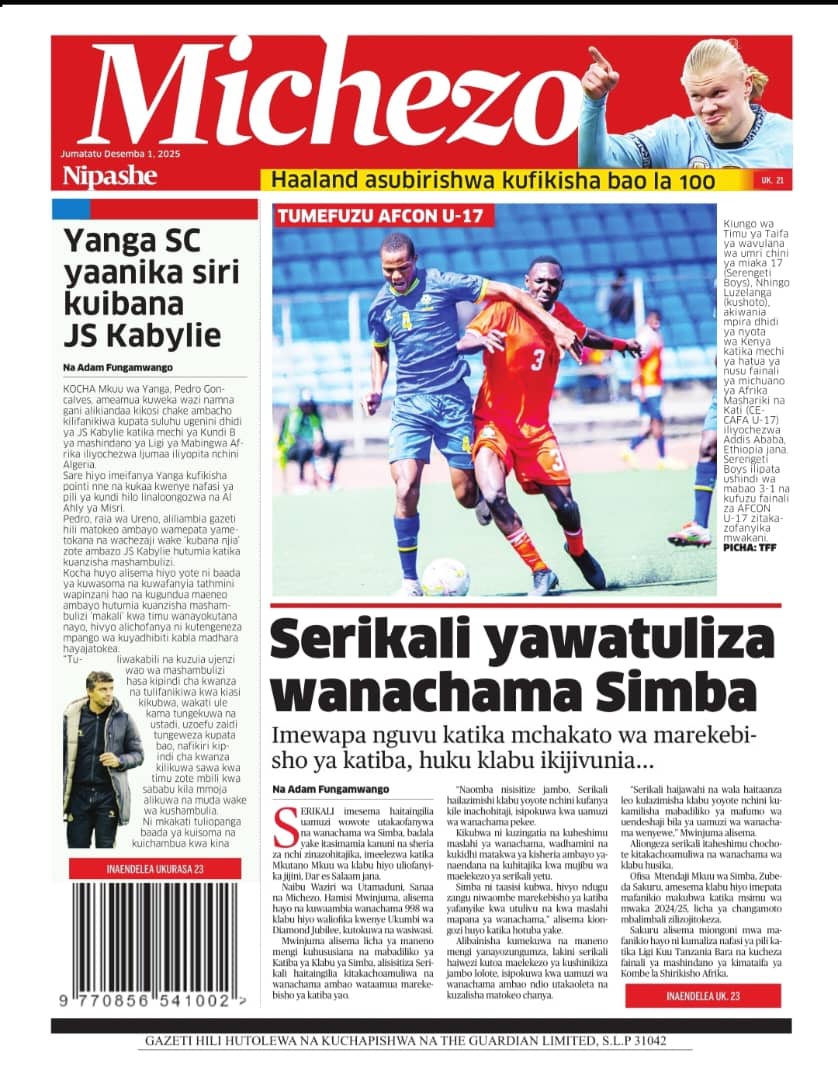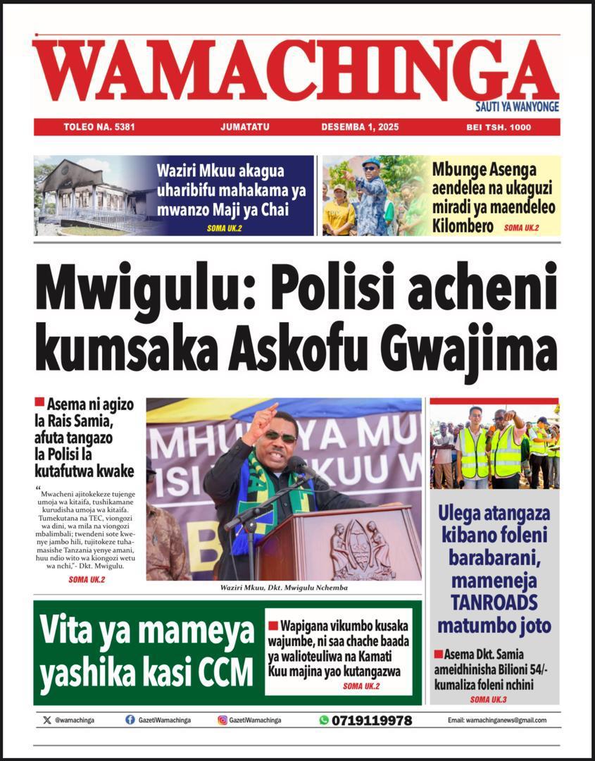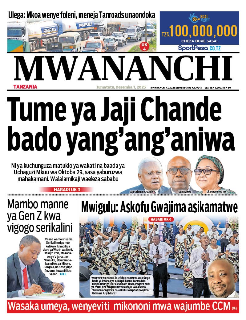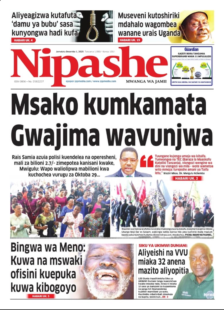 Home NEWSPAPERS HAYA HAPA MAGAZETI YA LEO DISEMBA 01_2025. HAYA HAPA MAGAZETI YA LEO DISEMBA 01_2025. By ENNA SIMION - December 1, 2025 FacebookTwitterTelegramWhatsAppCopy URL http://HAYA HAPA MAGAZETI YA LEO DISEMBA 01_2025.Thank you for reading this post, don't forget to subscribe!