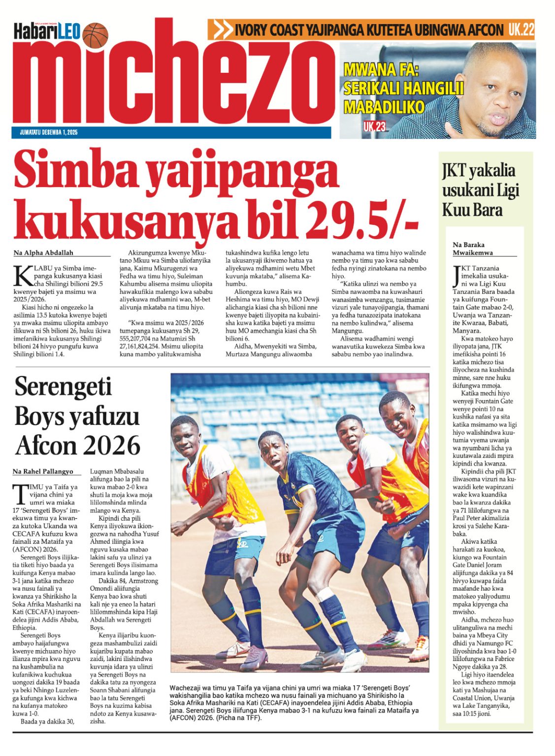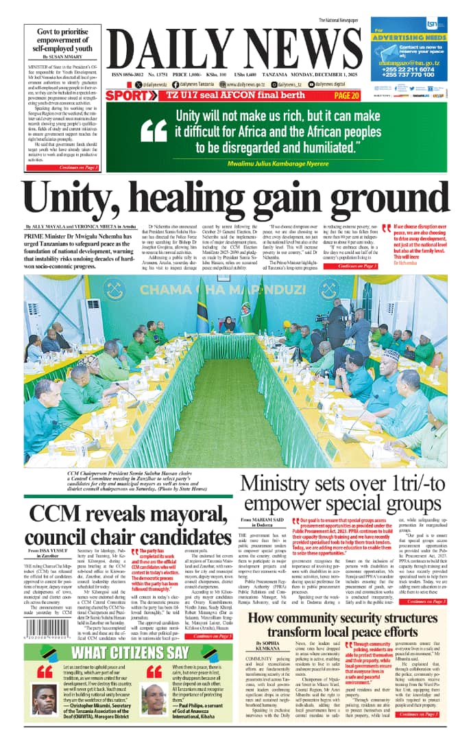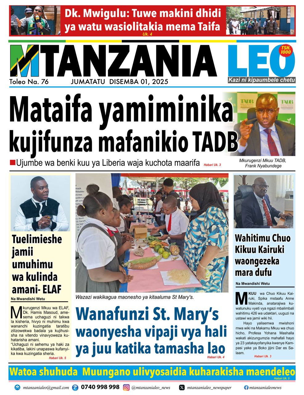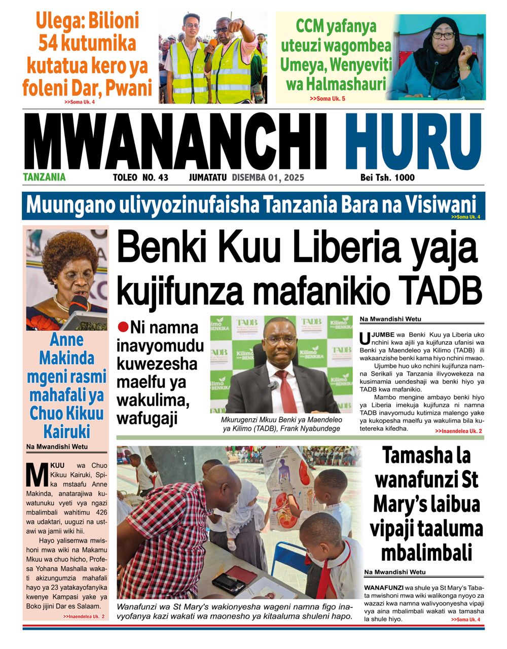 Home NEWSPAPERS HAYA HAPA MAGAZETI YA LEO DISEMBA 01_2025. HAYA HAPA MAGAZETI YA LEO DISEMBA 01_2025. By ENNA SIMION - December 1, 2025 FacebookTwitterTelegramWhatsAppCopy URL http://HAYA HAPA MAGAZETI YA LEO DISEMBA 01_2025.Thank you for reading this post, don't forget to subscribe!