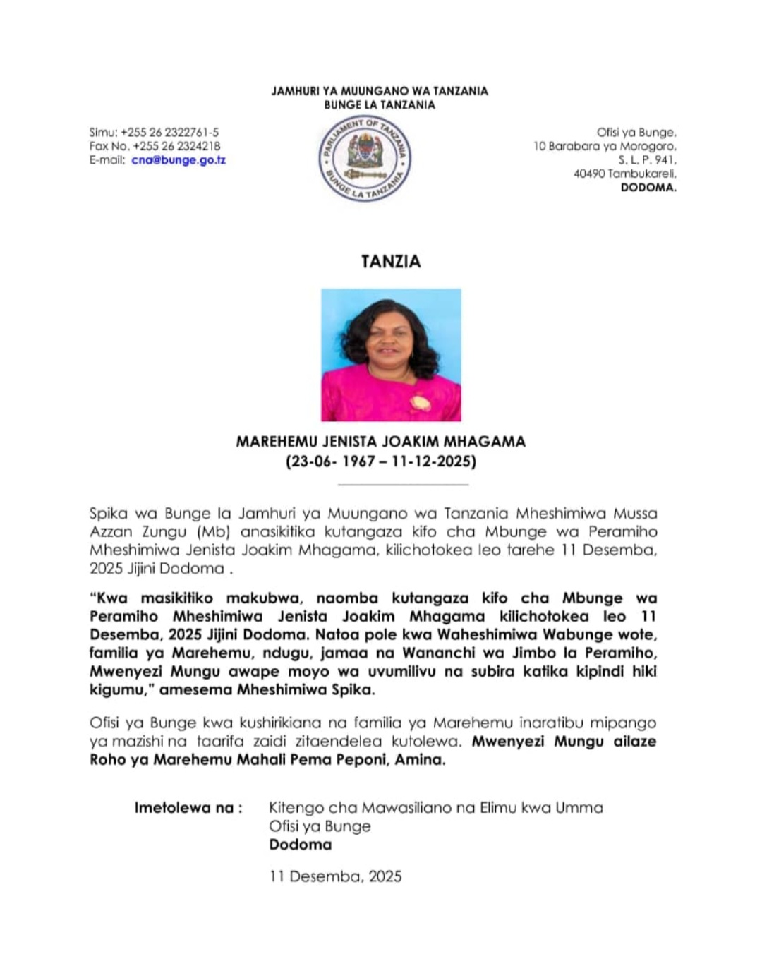 “Kwa masikitiko makubwa, naomba kutangaza kifo cha Mbunge wa Peramiho Mhe. Jenista Joakim Mhagama kilichotokea leo 11 Desemba,2025 Jijini Dodoma. Natoa pole kwa Waheshimiwa Wabunge wote, familia ya marehemu, ndugu, jamaa na Wananchi wa Jimbo la Peramiho.