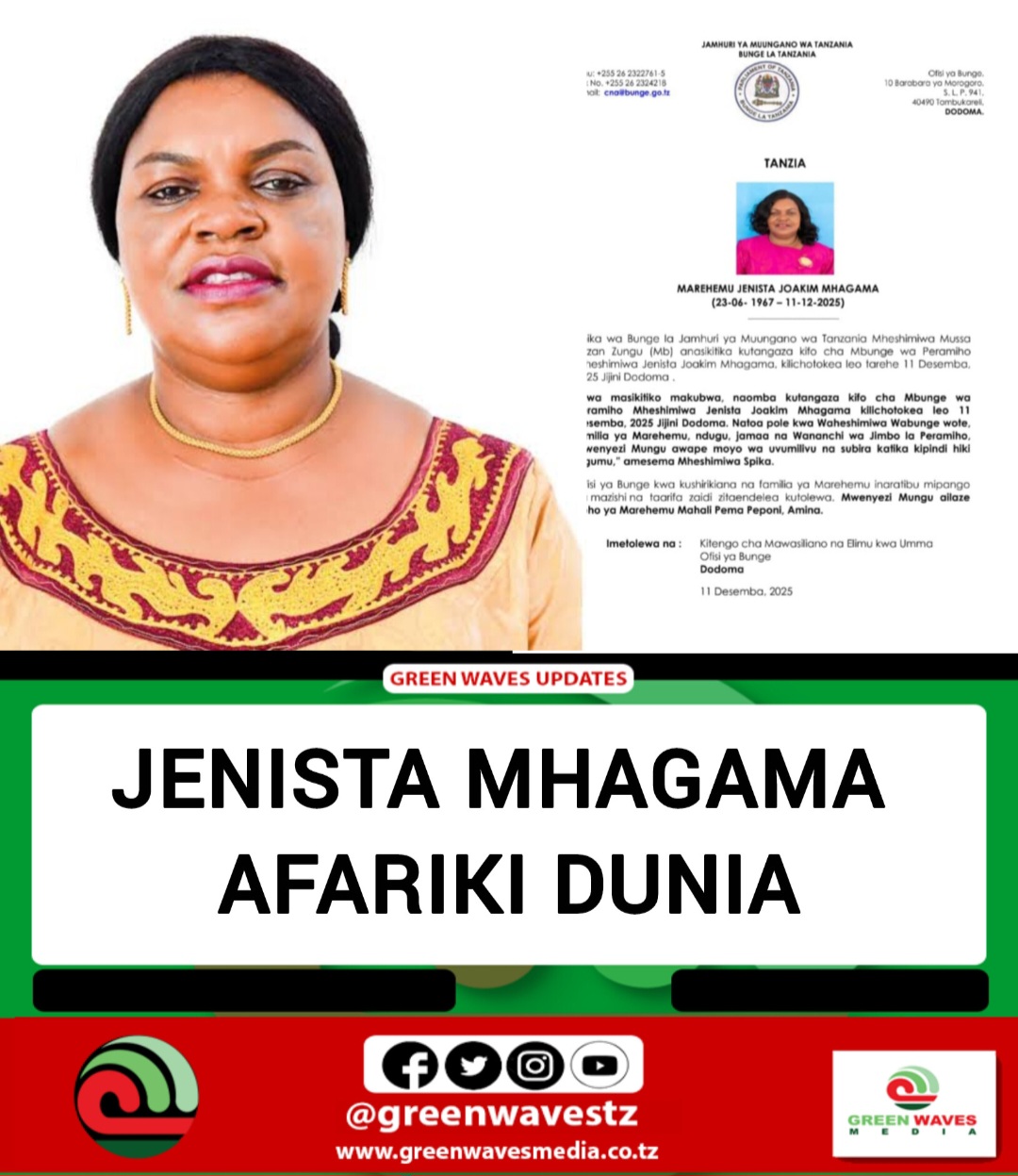 Spika wa Bunge la Jamhuri ya Muungano wa Tanzania, Mhe. Mussa Azzan Zungu (Mb), ametangaza kifo cha Mbunge wa Peramiho, Mhe.Jenista Joakim Mhagama, kilichotokea leo tarehe 11 Desemba 2025Jijini Dodoma Katika taarifa hiyo, Spika Zungu amesema: