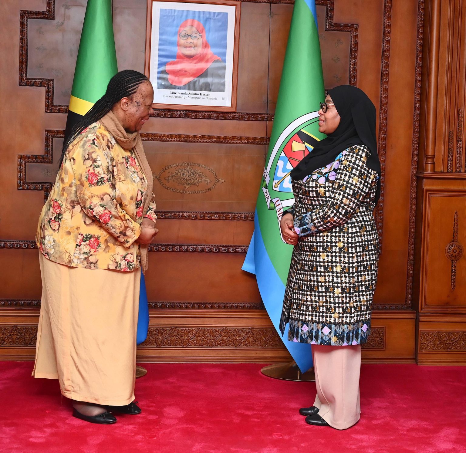Rais wa Jamhuri ya Muungano wa Tanzania, Mhe. Dkt. Samia Suluhu Hassan akiagana na Waziri Mstaafu wa Mambo ya Mahusiano ya Kimataifa na Ushirikiano wa Afrika ya Kusini, Dkt. Grece Naledi Mandisa Pandor, ambaye pia ni Mjumbe Maalum wa Rais wa Afrika ya Kusini, Mhe. Cyril Ramaphosa, baada ya kukabidhi Ujumbe huo Ikulu ndogo Tunguu, Zanzibar, tarehe 19 Desemba, 2025.