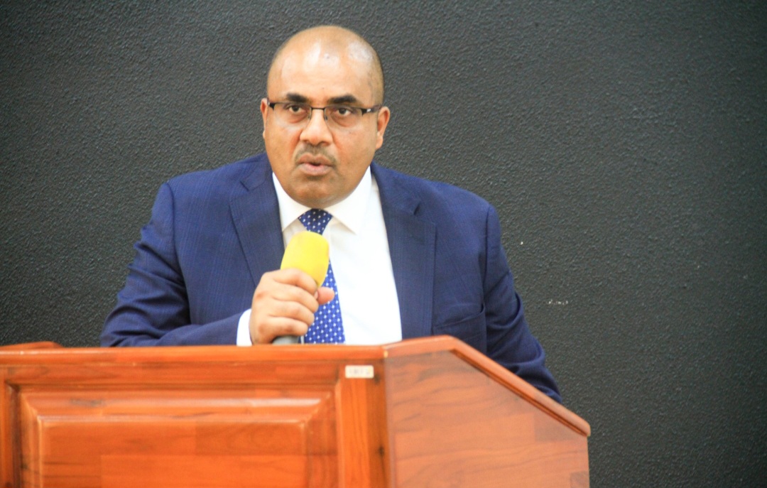 Meneja Habari na Uhusiano wa NHC Muungano Saguya, akizungumza alipokuwa akitoa salamu za ukaribisho mapema wakati wa ziara ya Waziri wa Ardhi, Nyumba na Maendeleo ya Makazi, Dk. Leonard Akwilapo, alipotembelea makao makuu ya Shirika hilo, leo January 5,2026, Jijini Dar es Salaam.