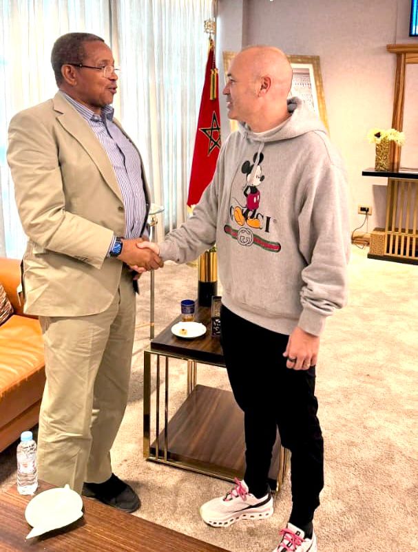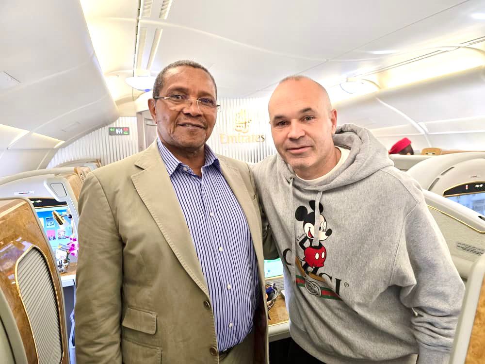 Rais mstaafu wa Jamhuri ya Muungano wa Tanzania, Dkt. Jakaya Mrisho Kikwete, akiwa na Andrés Iniesta, gwiji wa soka wa FC Barcelona na timu ya taifa ya Spain, walipokutana katika Uwanja wa Ndege wa Casablanca wakijiandaa kuondoka.