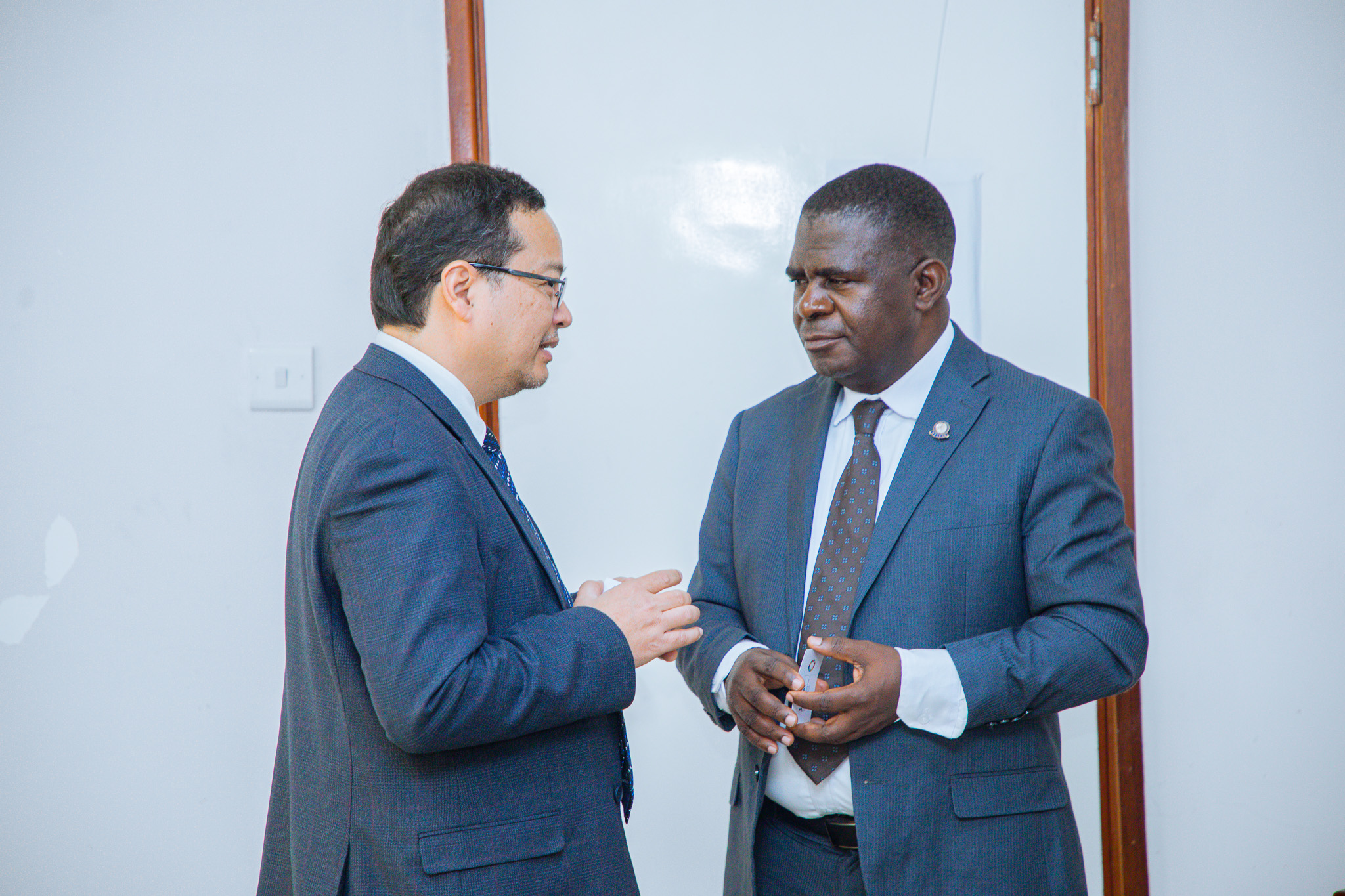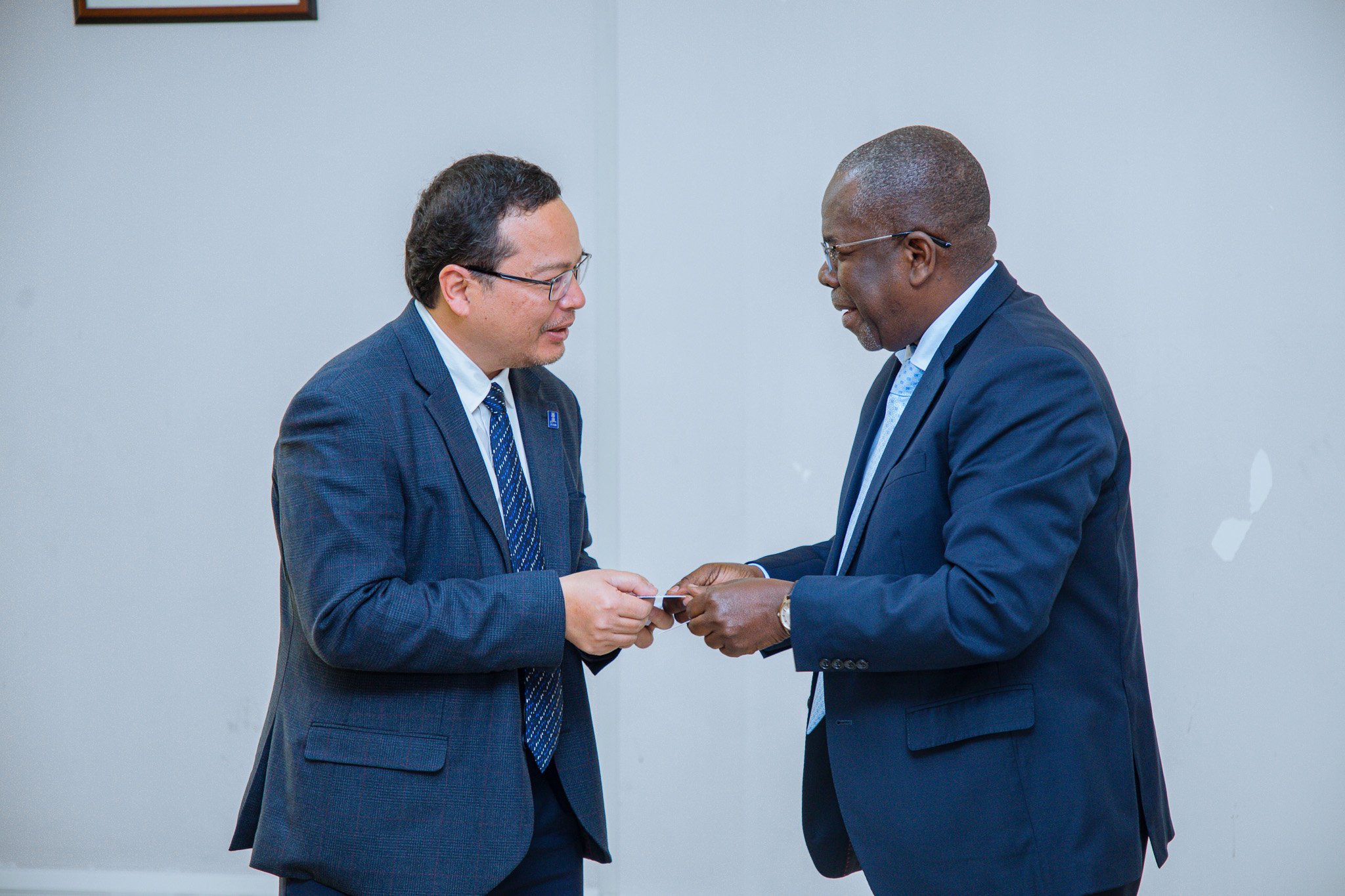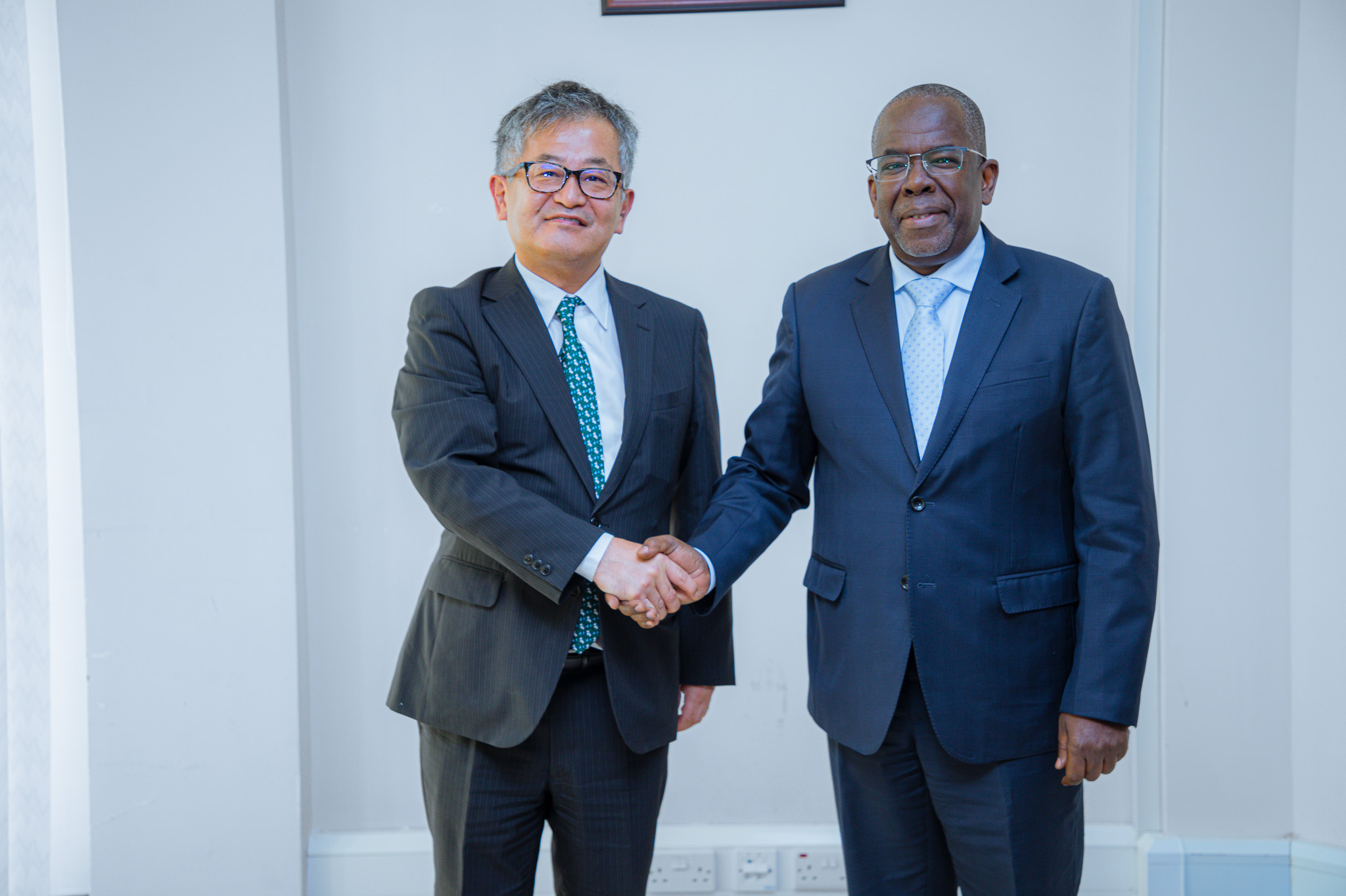 Waziri wa Fedha, Mhe. Balozi Khamis Mussa Omar (Mb) (kulia), akiagana na Balozi wa Japan nchini Tanzania, Mhe. Yoichi Mikami, aliyefika kwa ajili ya kujitambulisha na kujadili masuala mbalimbali ya ushirikiano wa kiuchumi na maendeleo kati ya Tanzania na Japan, katika Ofisi ya Waziri wa Fedha, Treasury Square, jijini Dodoma.